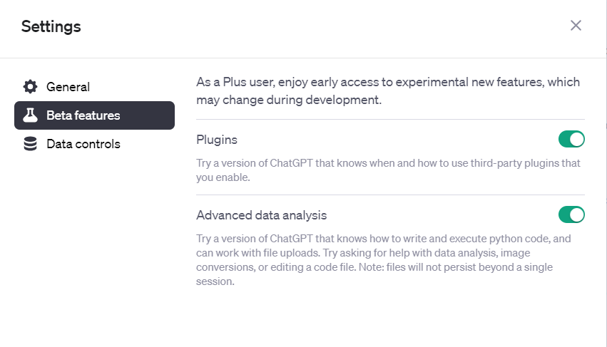 설정에 들어가셔서 Beta features에서 플러그인, Advanced data analysis(ADA) 기능 등을 켰는지 확인해봅시다.